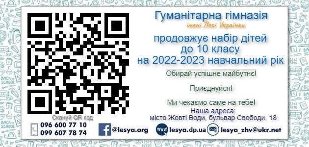 Гуманітарна гімназія імені Лесі Українки запрошує учнів 9-х класів міста на навчання до 10-х класів за профілями: філологічний (іноземна філологія); історико-правовий. Скануй QR код Чому варто обрати саме наш заклад: Якісна підготовка до ЗНО та вступу до ВУЗів України і не тільки; Вільне володіння іноземними мовами; Співпраця з ВНЗ України, [...] Читати далі