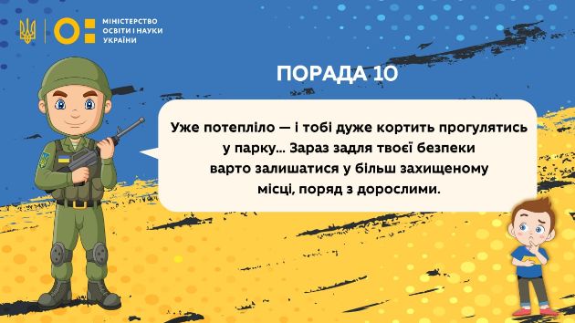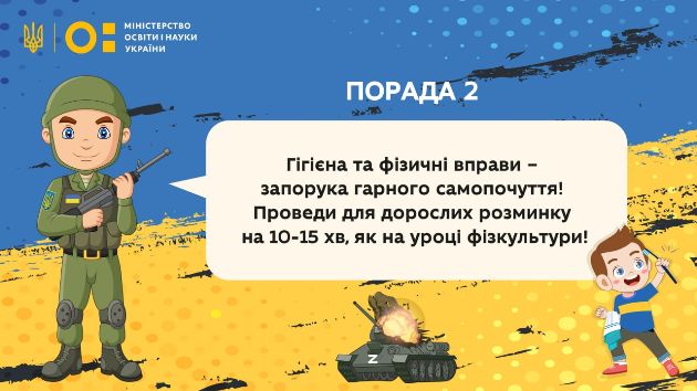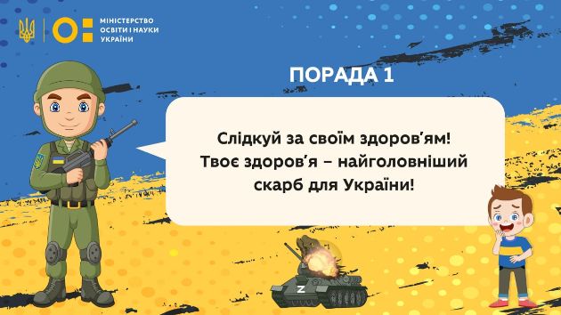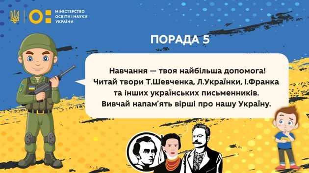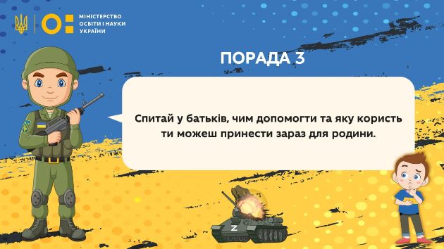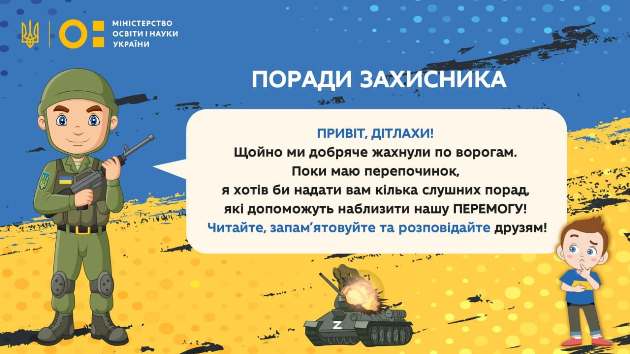 "Через воєнні дії в Україні сьогодні діти позбавлені спокою, вільного неба над головою, а також навчання. Щоб допомогти найменшим українцям емоційно у найважчі хвилини війни та підтримувати патріотичний дух нашої нації МОН представляє авторитетні поради від захисника України", - зазначив Міністр освіти і науки Сергій Шкарлет.
