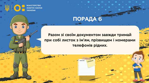 Порада № 6 "Разом зі своїм документом завжди тримай при собі листок з ім’ям, прізвищем і номерами телефонів рідних"