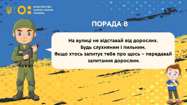 Порада № 8 "На вулиці не відставай від дорослих. Будь слухняним і пильним. Якщо хтось запитує тебе про щось – передавай запитання дорослим."