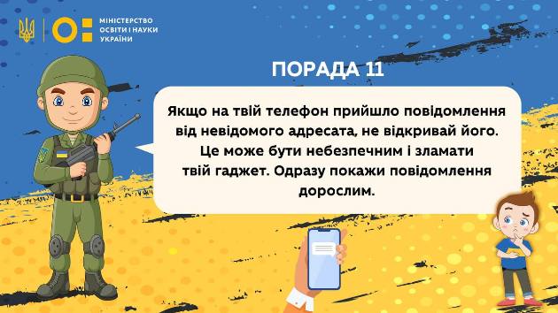 Порада № 11 "Бути обережним з повідомленнями, які приходять на телефон, адже вони можуть бути небезпечними"