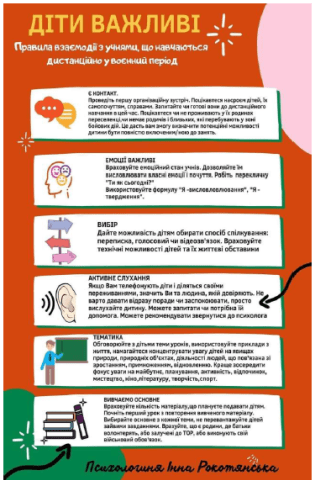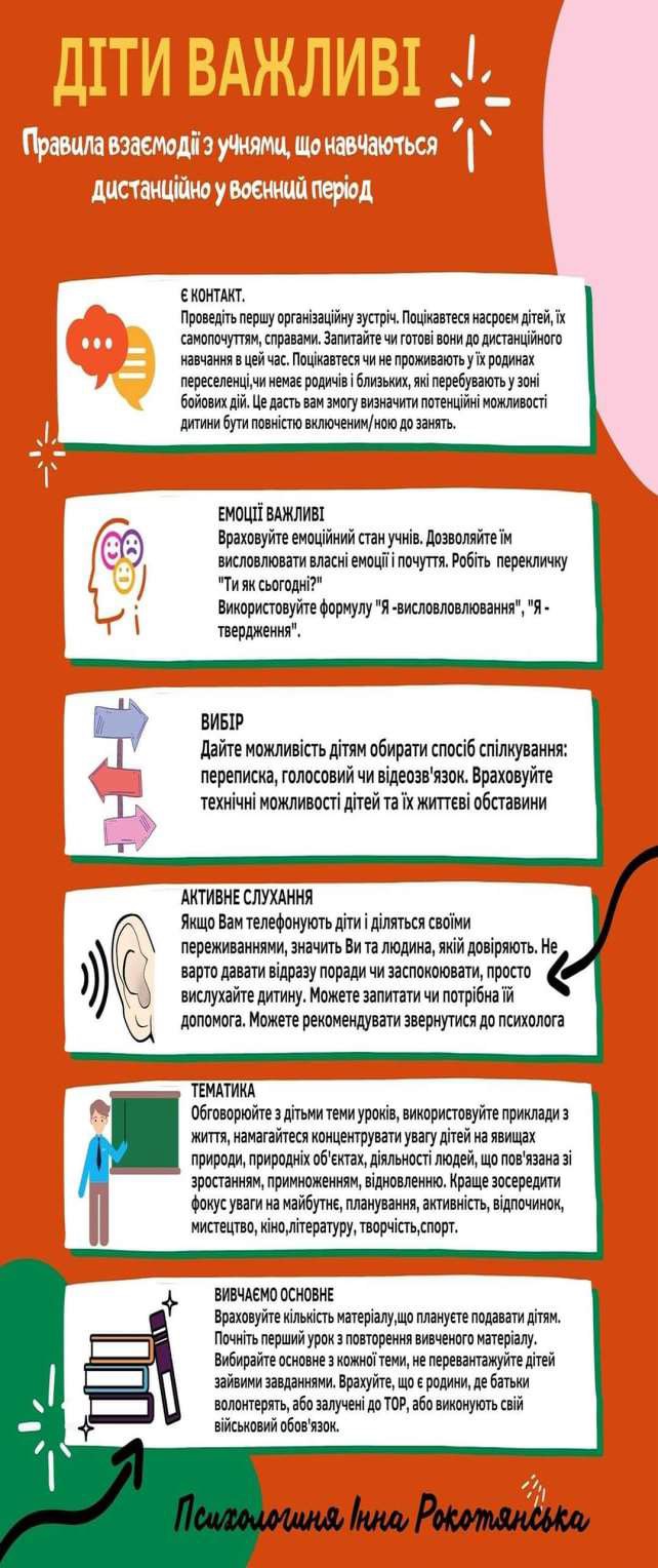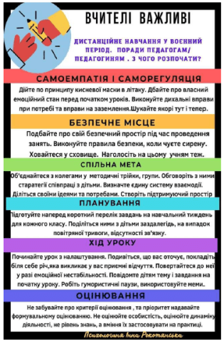 Згідно листа МОН України «Про організацію освітнього процесу» No 1/3371-22 від 06.03.2022, «Про практику застосування трудового законодавства у галузі освіти і науки під час дії правового режиму воєнного стану» No 1/3377-22 від 07.03.2022 та Положення про дистанційну форму здобуття повної загальної середньої освіти, затверджене наказом МОН України від 08.09.2020 No 1115, зареєстроване в Міністерстві юстиції України 28.09.2020 за No 941/35224.